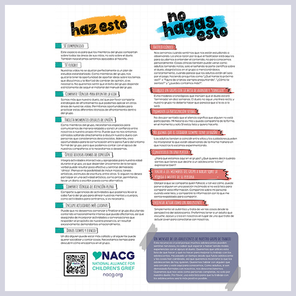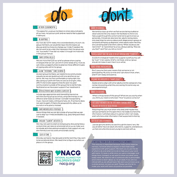 Provides peer-based support groups for grieving children, teens, and their families. Programs include in-person support, education, and community outreach.